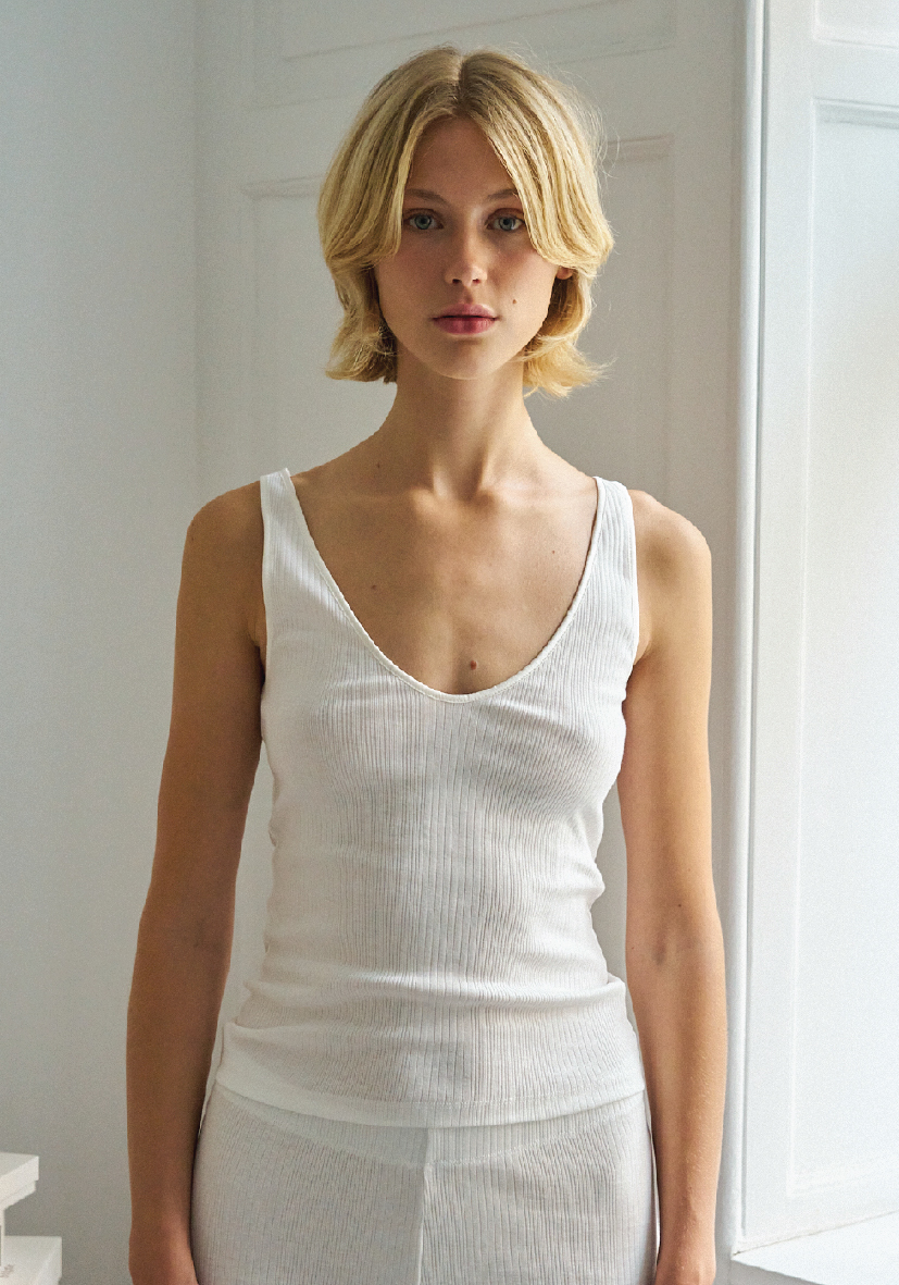 April tanktop is manufactured from our Signature rib fabric, an incredibly soft, uneven textured ribbed fabric, a brand signature organic fabric since the very first collection in 2017.