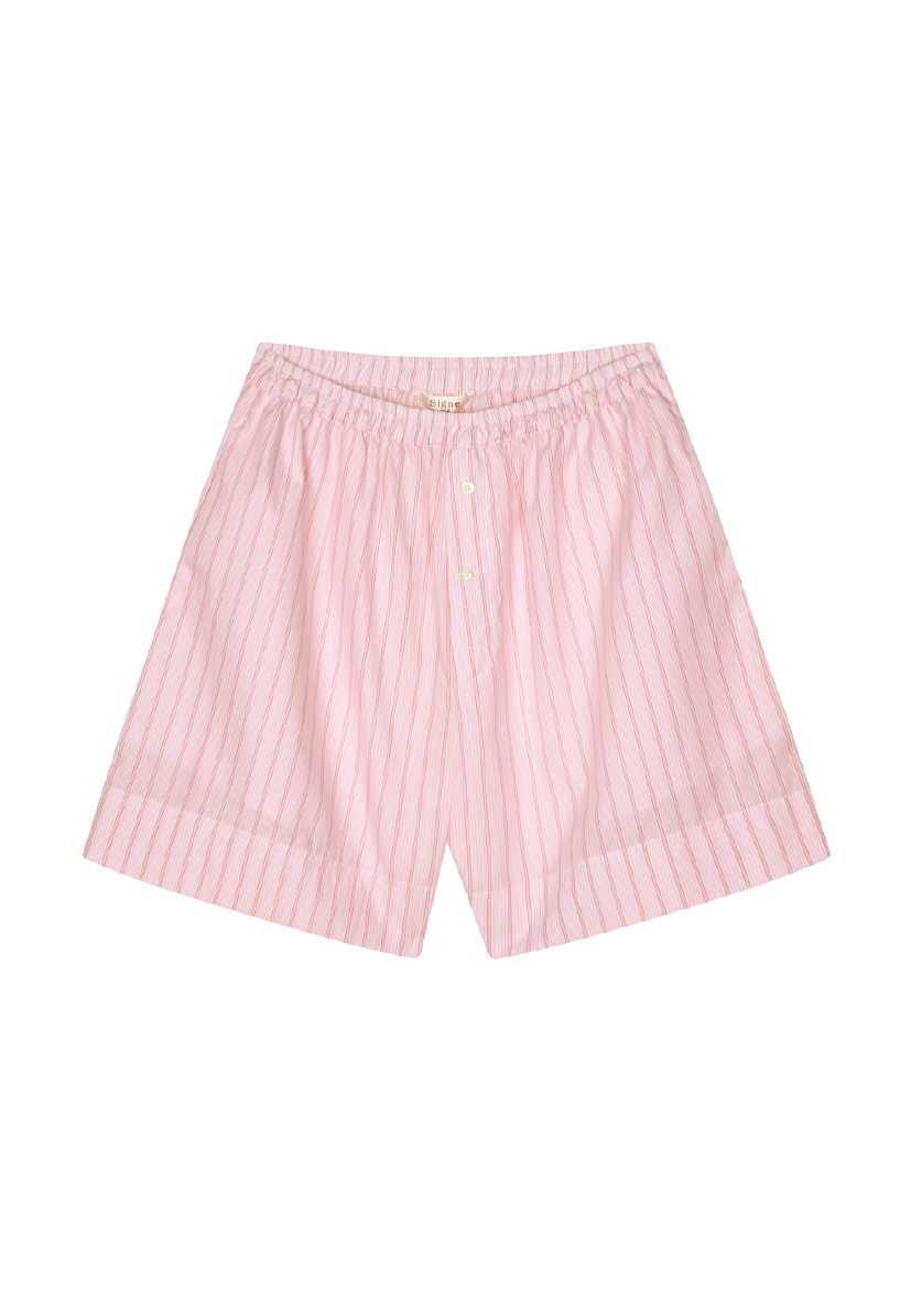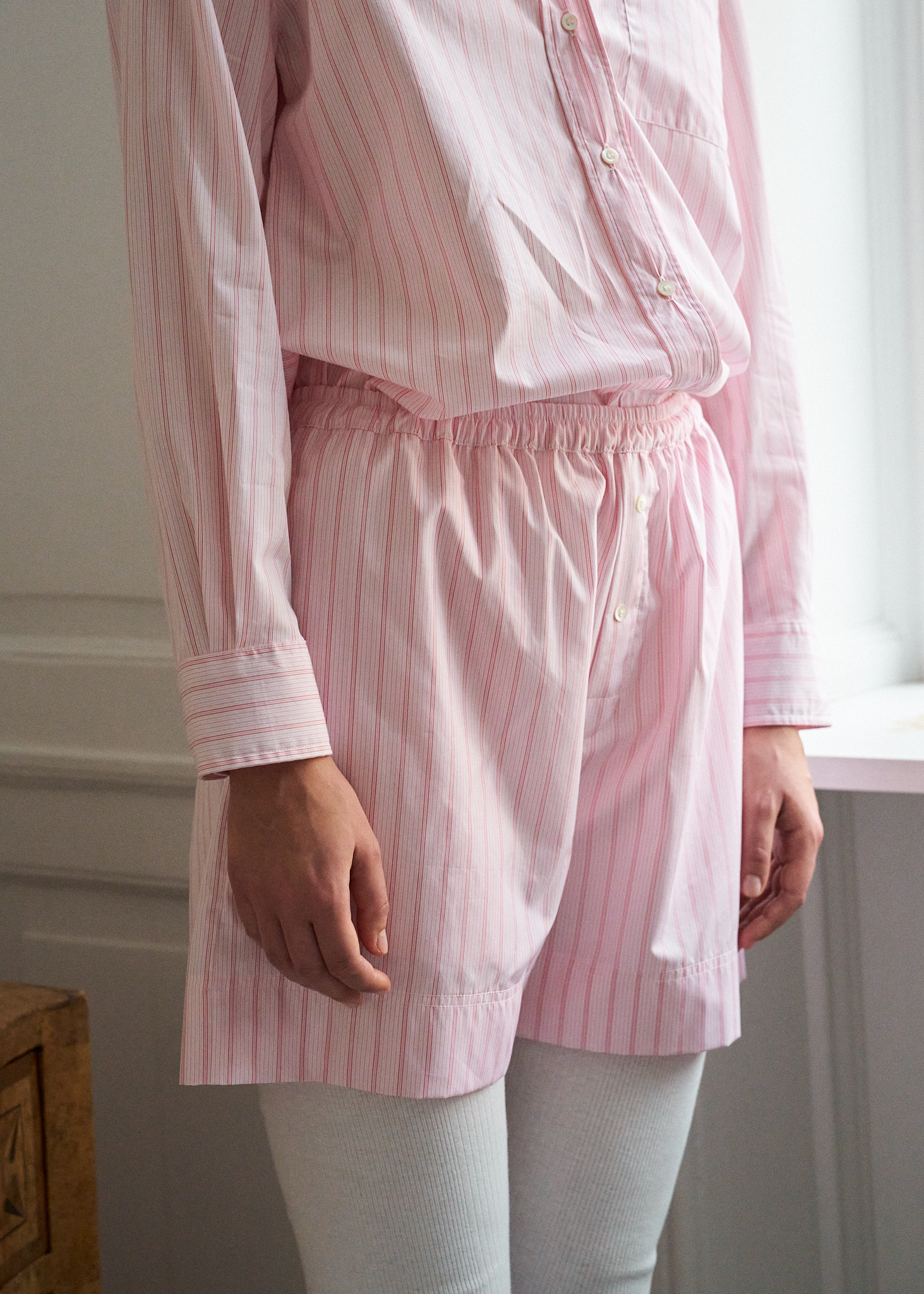 Classic mid-length shorts with elastic waist. Made from an organic cotton poplin fabric. These shorts have a backpocket with mother-of-pearl button closure. Responsibly manufactured in our own atelier in Turkey.