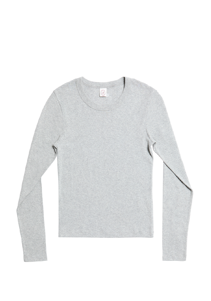 A brand heritage style in a new grey melange color for Autumn Winter season 2025. A classic longsleeve Tshirt with a flattering round crewneck. June longsleeve is made from a soft organic cotton fabric and features a subtle monogram embroidery in the neck. Responsibly manufactured in our own atelier Turkey.