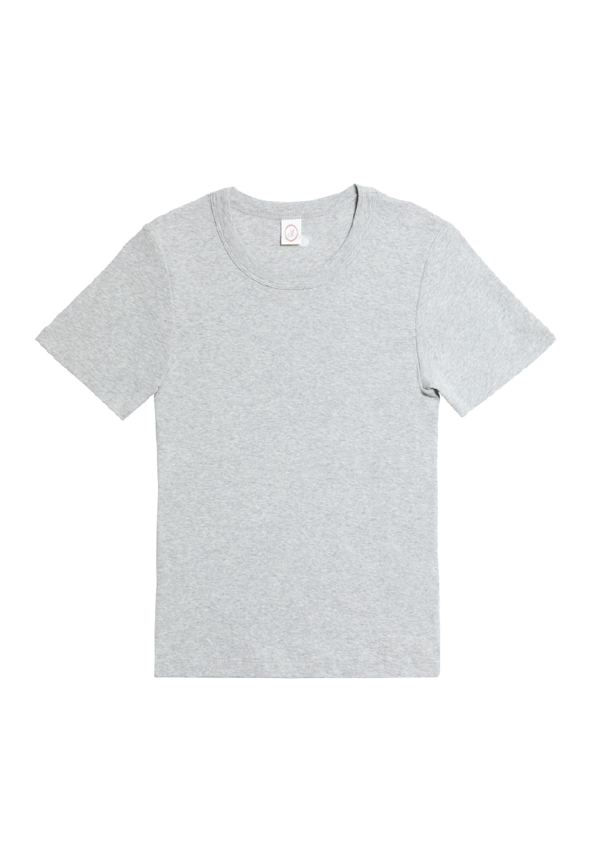 A brand heritage style in a new seasonal grey melange color for the Autumn Winter 2025 collection. A classic fitted Tshirt with a flattering crewneck and short sleeves. June T-shirt is made from a soft organic cotton fabric and features a subtle monogram embroidery in the neck. Responsibly manufactured in our own atelier Turkey.