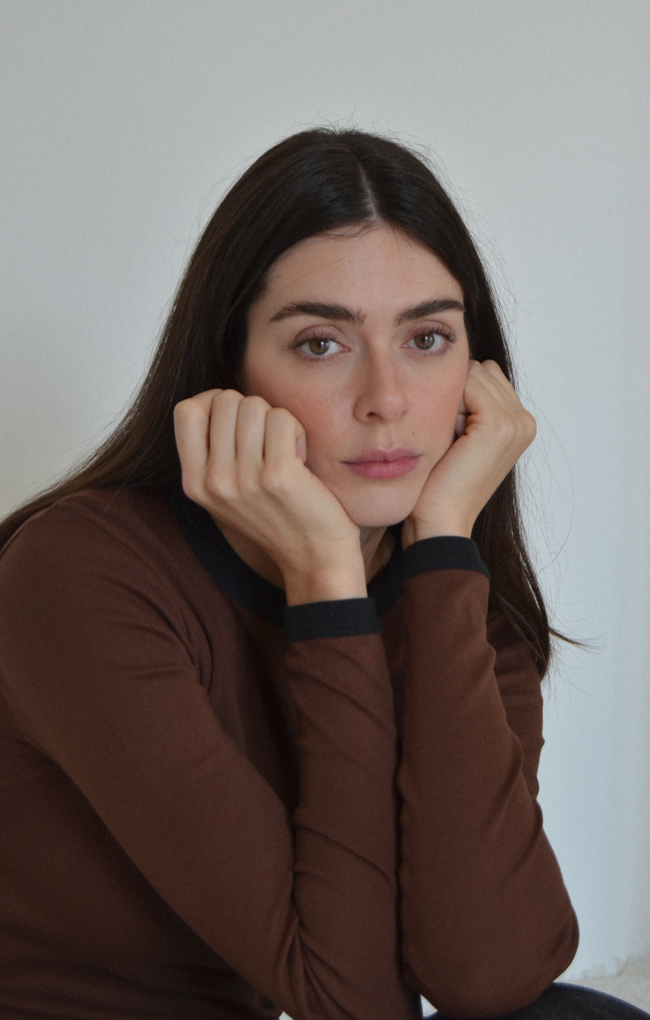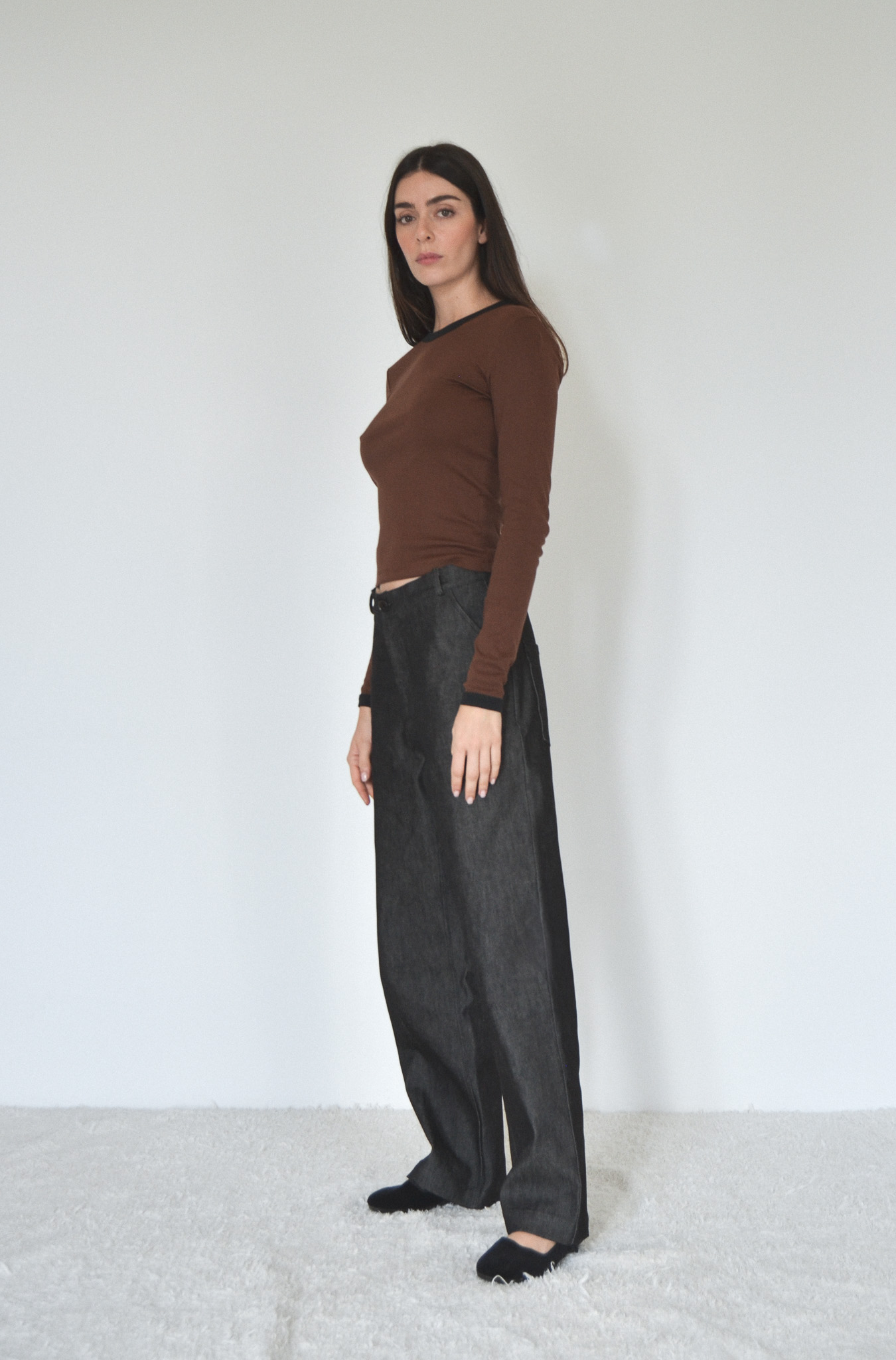 A brand heritage style in a new brown & black contrast trim color combination for Autumn Winter season 2025. A classic longsleeve Tshirt with a flattering round crewneck. June longsleeve is made from a soft organic cotton fabric and features a subtle monogram embroidery in the neck. Responsibly manufactured in our own atelier Turkey.
